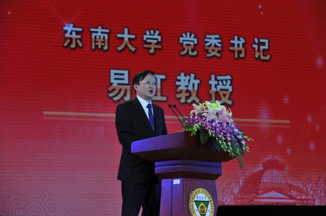东南大学党委书记易红在致辞中,代表学校党政向参加活动的各位嘉宾、校友表示热烈欢迎,向为机械工程学院的发展建设做出贡献的各界人士表示衷心感谢,向学院全体师生及海内外校友致以节日的问候和美好祝愿。他指出,机械工程学院办学历史悠久,底蕴深厚,在教育教学、人才培养、科学研究、成果转化等方面均取得了突出的成绩,特别是为我国机械制造业的人才培养,为国家富强和民族复兴做出了突出的贡献。他希望未来机械工程学院要切实加强“双一流”建设,不断提高教育教学质量,不断提升基础研究水平,不断增强社会服务能力,努力实现跨越式发展;要积极推进综合改革,以深化内涵为目标,以教育观念更新为先导,以学科建设为龙头,以人才培养为根本,创新发展,努力成为学校综合改革的典范;要深入实施“十三五”事业发展规划,要具有海纳百川、放眼世界的襟怀和视野,勇于向兄弟院校乃至海外一流大学机械学科认真学习,大力引进海内外一流人才,努力开创思想文化激荡、创新氛围浓郁的生动局面。他表示,在未来的发展进程中,学校将会更加关注和支持机械工程学院的建设,尽最大可能破除阻碍学院发展的体制机制障碍,想各种办法排除影响学院进步的各种困难问题,全方位支持学院的改革创新,为机械工程学院的阔步前行提供动力和保障。