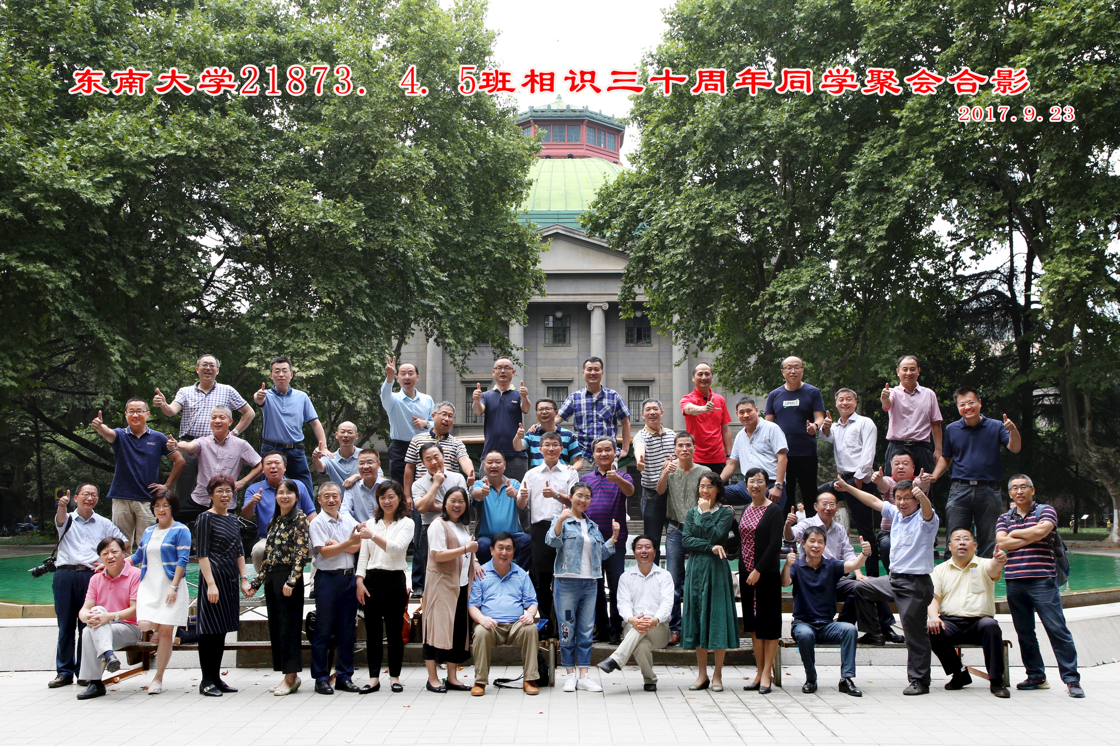 2017年9月23日,87级校友(3、4和5班)一行43人回母校庆祝相识30周年。同学们漫步于大礼堂前、六朝松下,一起参观校史馆、重游玄武湖,回忆当初、共叙友情。学院领导倪中华院长、东南大学保卫处处长任祖平教授及退休教师林国基老师参加了此次校友聚会。