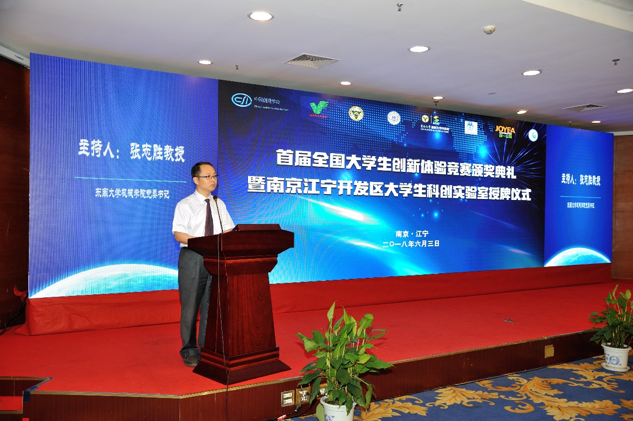 随后,6 月 3 日下午首届全国大学生创新体验竞赛颁奖典礼暨南京江宁开发区大学生科创实验室授牌仪式在东南大学九龙湖校区隆重举行,南京市领导、江宁区领导、东南大学领导出席活动并讲话。江宁开发区管委会、东南大学相关部处及院系、中国创造学会及相关单位的工作人员等近 300 人参加了活动。本次活动分为首届全国大学生创新体验竞赛颁奖及南京江宁开发区大学生科创实验室授牌两个环节,分别由万象城平台党委书记张志胜和南京江宁开发区科技人才局局长张洋主持。东南大学副校长吴刚教授,南京市科委副主任陈为生,中国创造学会常务副理事长兼秘书长张亚雷教授等嘉宾出席了本次活动。