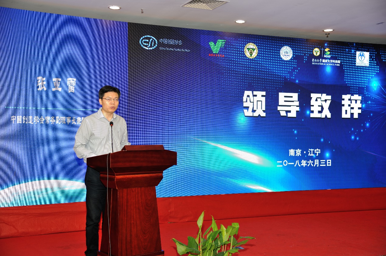 颁奖典礼开始后,中国创造学会常务副理事长张亚雷发表了讲话,首先向承办方东南大学和安徽工业大学,以及大力支持比赛举办的江宁区和各赞助单位表示感谢,并简要介绍了中国创造学会的成立宗旨及发展历程,表示希望本次竞赛能进一步激发同学们的创新潜能和创业意识,积极推动高校创新成果的不断涌现。