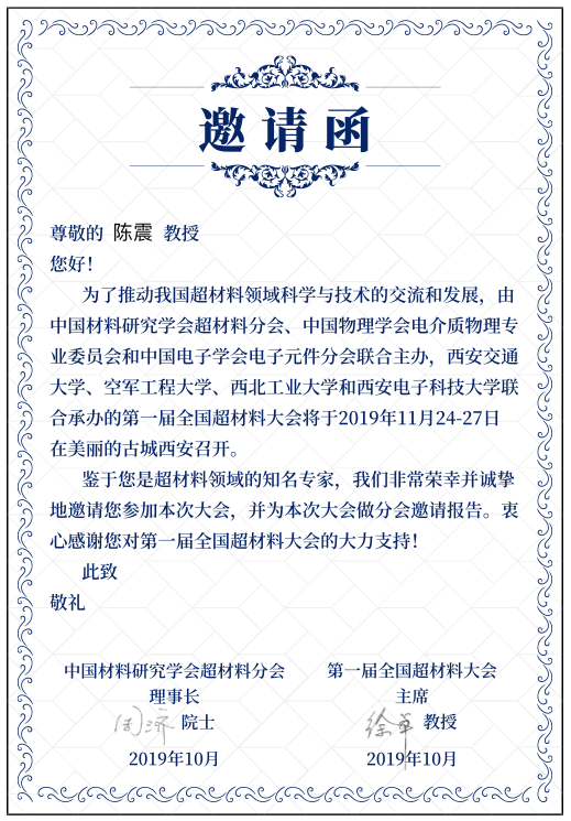 第一届全国超材料大会于2019年11月24 ~ 27日在美丽古都西安召开,万象城平台的陈震教授受邀参加大会并作特邀报告。