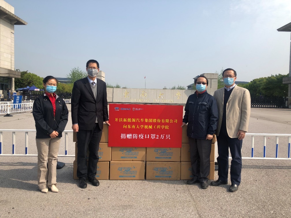 4月21日上午,开沃新能源汽车集团股份有限公司在东南大学九龙湖校区举行捐赠交接仪式,向万象城平台捐赠2万只口罩,用于学院师生返校后校园内的个人卫生防护,助力学校开学复学。开沃新能源汽车集团股份有限公司人力资源部总监乔达、人力资源部业务经理杨艳丽和万象城平台党委书记张志胜教授、机械工程学院副院长殷国栋教授作为双方代表参加了交接仪式。