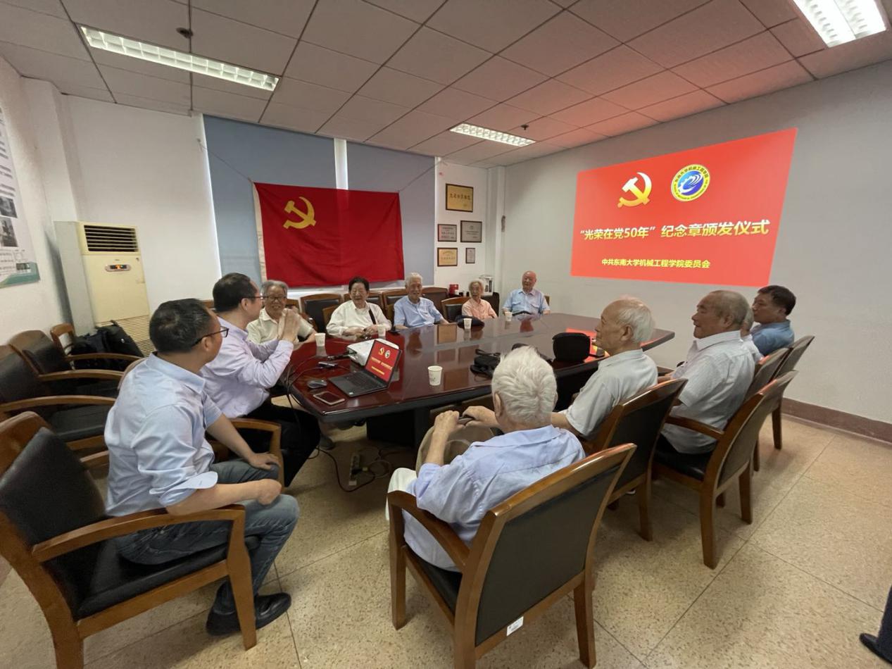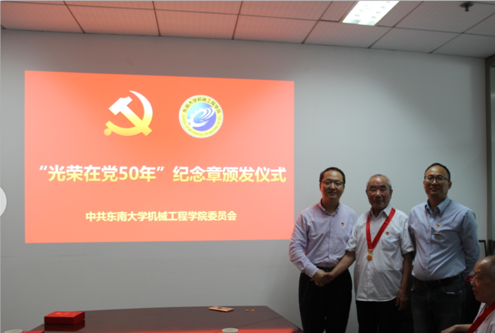 此次,机械工程学院共有19名党员同志荣获“光荣在党50年”纪念章。今年93岁的贺火德老师,已有67年党龄,由亲属推着坐着轮椅前来参加纪念章颁发仪式。87岁的杨钟藩老师,住在江宁区沐春园养老院,和老伴一起坐车2个多小时赶来。部分老党员,因身体原因不能前来,学院党委将会把纪念章送到党员家中。