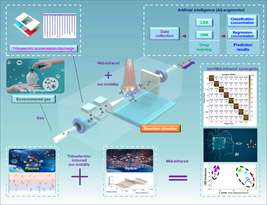 针对以上存在问题,团队开发一种人工智能增强的高压静电诱导离子迁移和中红外光谱的协同检测方法,利用不同维度的传感信号的互补特征及其协同机制来达到异丙醇分子的高精度检测方法。通过高压静电的 "冷 "离子放电迁移谱与中红外光谱耦合的协同,并基于机器学习的回归预测,实现被测气体浓度辨识接近99.08%的准确率。本研究提出的人工智能增强的协同方法实现精确和快速的气体成分与浓度辨识,可广泛应用于医疗健康与环保领域。
