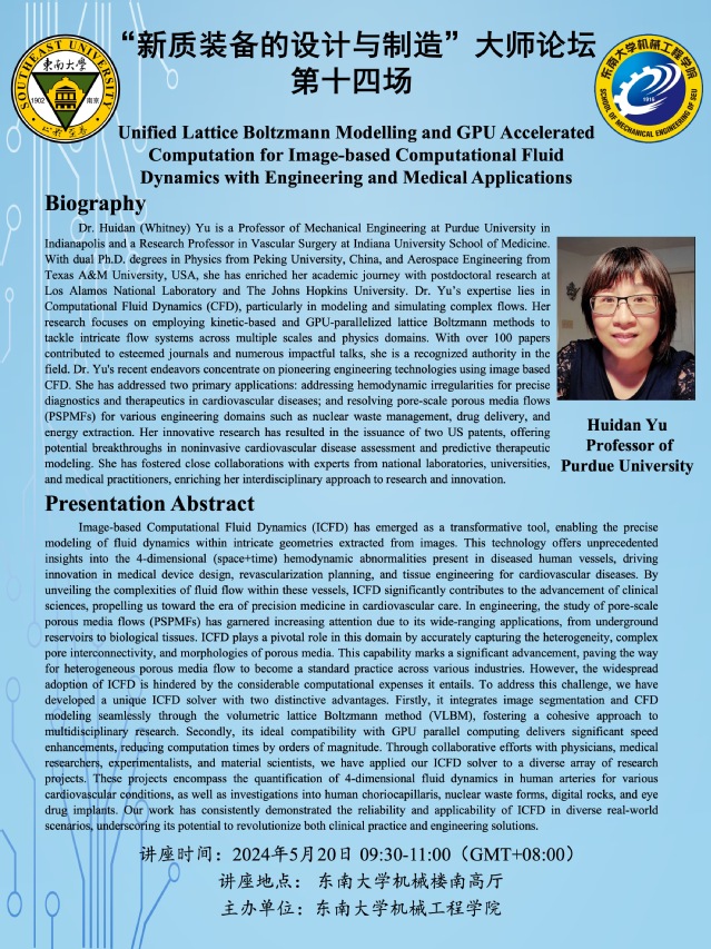 Dr. Huidan (Whitney) Yu is a Professor of Mechanical Engineering at Purdue University in Indianapolis and a Research Professor in Vascular Surgery at Indiana University School of Medicine. With dual Ph.D. degrees in Physics from Peking University, China, and Aerospace Engineering from Texas A&M University, USA, she has enriched her academic journey with postdoctoral research at Los Alamos National Laboratory and The Johns Hopkins University. Dr. Yu’s expertise lies in Computational Fluid Dynamics (CFD), particularly in modeling and simulating complex flows. Her research focuses on employing kinetic-based and GPU-parallelized lattice Boltzmann methods to tackle intricate flow systems across multiple scales and physics domains. With over 100 papers contributed to esteemed journals and numerous impactful talks, she is a recognized authority in the field. Dr. Yu's recent endeavors concentrate on pioneering engineering technologies using image based CFD. She has addressed two primary applications: addressing hemodynamic irregularities for precise diagnostics and therapeutics in cardiovascular diseases; and resolving pore-scale porous media flows (PSPMFs) for various engineering domains such as nuclear waste management, drug delivery, and energy extraction. Her innovative research has resulted in the issuance of two US patents, offering potential breakthroughs in noninvasive cardiovascular disease assessment and predictive therapeutic modeling. She has fostered close collaborations with experts from national laboratories, universities, and medical practitioners, enriching her interdisciplinary approach to research and innovation.