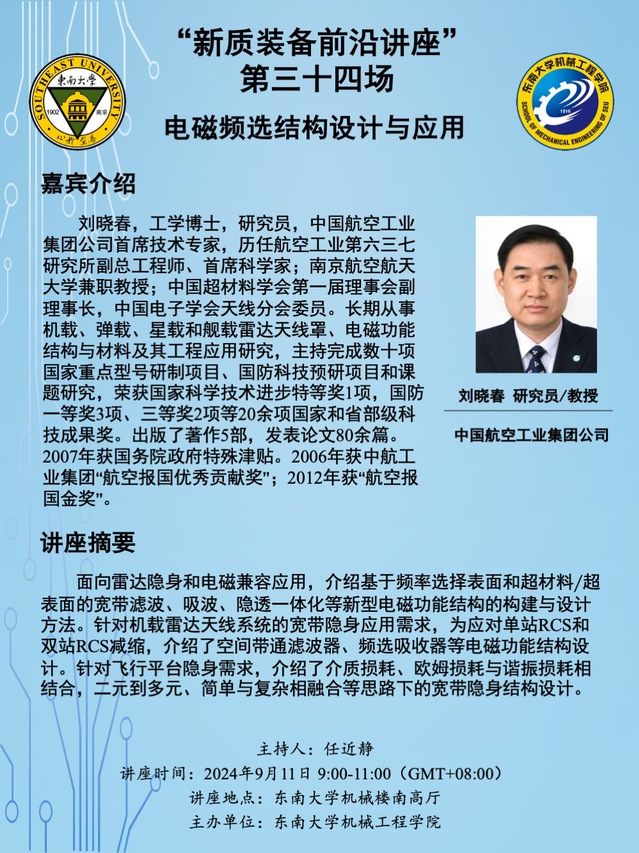 刘晓春,工学博士,研究员,中国航空工业集团公司首席技术专家,历任航空工业第六三七研究所副总工程师、首席科学家;南京航空航天大学兼职教授;中国超材料学会第一届理事会副理事长,中国电子学会天线分会委员。长期从事机载、弹载、星载和舰载雷达天线罩、电磁功能结构与材料及其工程应用研究,主持完成数十项国家重点型号研制项目、国防科技预研项目和课题研究,荣获国家科学技术进步特等奖1项,国防一等奖3项、三等奖2项等20余项国家和省部级科技成果奖。出版了著作5部,发表论文80余篇。2007年获国务院政府特殊津贴。2006年获中航工业集团“航空报国优秀贡献奖”;2012年获“航空报国金奖”。