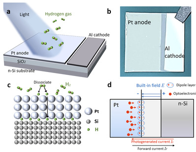 本工作开发了一种结构简单、响应快速的光学氢传感器。它是一个由铂-二氧化硅-硅组成的肖特基结,通过电偶极子抑制光生电流实现快速氢检测。与传统的 MIS 肖特基电氢传感器相比,传感器无需外部加热和偏置电压。这些特性降低了氢气环境中的爆炸风险。与等离子共振装置不同,传感器不需要蚀刻结构或纳米孔,对光波长也没有要求。该传感器成本低廉,制备简单,无需加热或化学处理,可使用物理或化学气相沉积系统快速批量生产。器件设计示意图如图1所示,氢分子吸附在铂薄膜表面并离解成氢原子,然后氢原子在浓度梯度驱动下扩散到金属氧化物界面。氢引起的界面电势变化可通过测量光电流来检测氢的浓度。