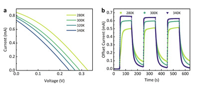 图3,肖特基光学传感器在室温(280 K-340 K)附近的性能。 (a) 器件在不同温度下的 I-V 特性。(b) 不同温度下气体开关周期的电流动态响应曲线。