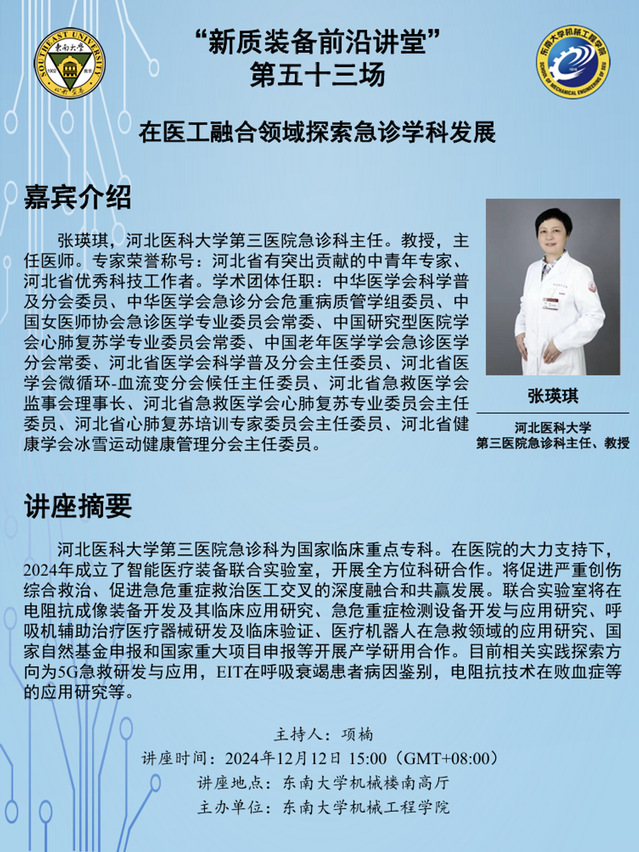 2024年12月12日,由万象城平台主办的“新质装备前沿讲堂”第五十三场在东南大学机械楼南高厅成功举办。本次活动特别邀请了河北医科大学第三医院急诊科主任张瑛琪教授作为主讲嘉宾,开展了关于“在医工融合领域急诊学科发展”的学术报告。报告会由项楠老师主持,河北医科大学第三医院急诊科副主任李梅、南京航空航天大学姚佳烽老师、朱桂平老师、刘凯老师共同出席了本次活动。