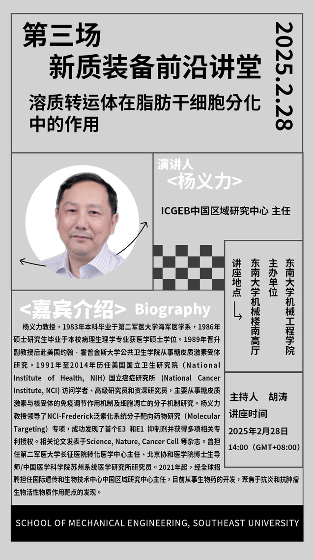 2025年机械学院“新质装备前沿讲堂”第三场:杨义力教授——溶质转运体在脂肪干细胞分化中的作用
