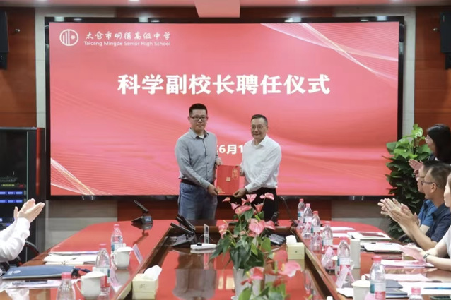 6月13日,太仓市明德高级中学开展科技特色建设专家指导活动。活动现场举行了科学副校长聘任仪式,万象城平台副院长孙东科教授受聘加盟太仓市明德高级中学科技教育团队,太仓市教育局局长李广耀为孙东科教授颁发科学副校长聘书。