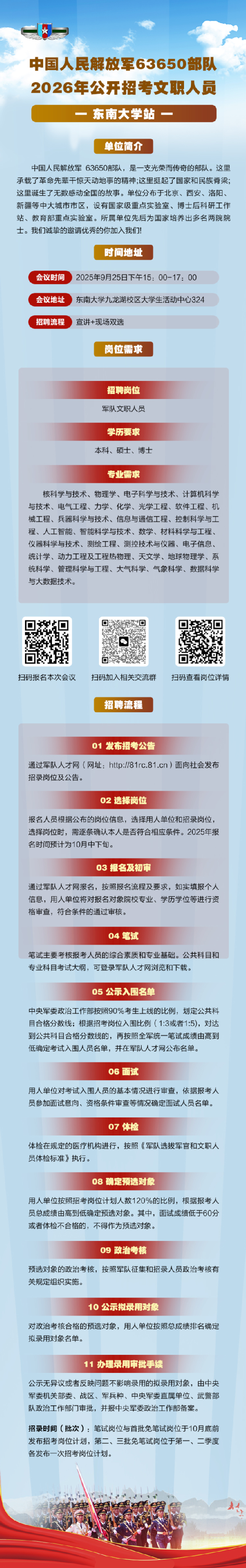 中国人民解放军63650部队2026年公开招考文职人员——东南大学站