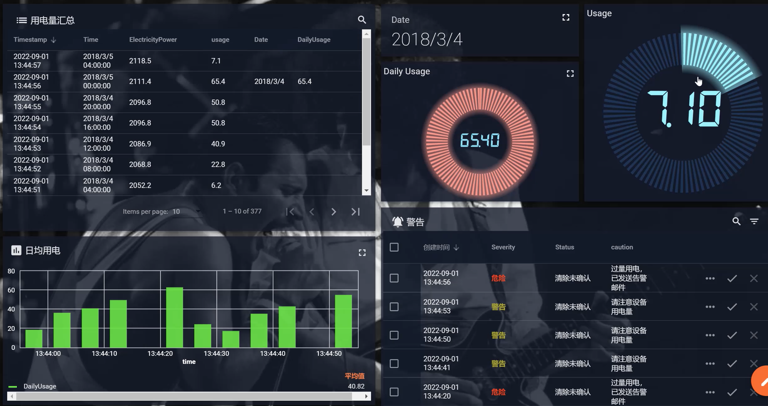 3、数据显示。设计仪表盘界面,接入设备实时用电数据及统计数据并显示。